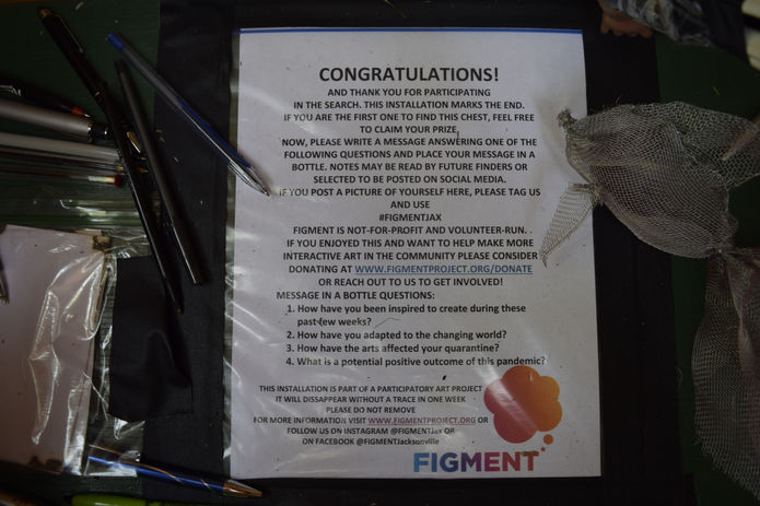 In 2019, I founded a local chapter of FIGMENT in Jacksonville, FL. FIGMENT is a global nonprofit dedicated to building community through participatory art. Immediately after, the Coronavirus pandemic broke out, putting a hold on all planned events. To adapt to the situation, we sought to build community in quarantine through socially distanced treasure hunt events. Participants had to solve puzzles and riddles leading them from location to location, scanning AR murals and QR codes in search of a final interactive art installation.